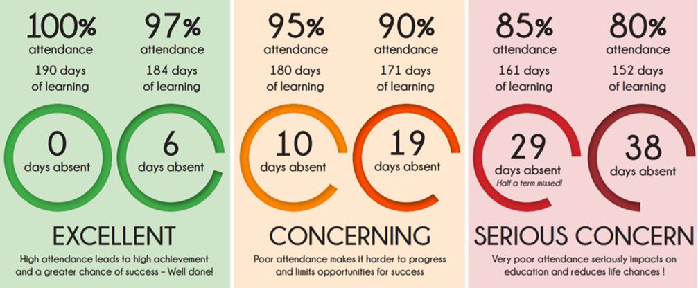 If attendance of a child continues to drop below 90%, our Education Welfare Officer and or Attendance lead will meet with families to offer further support in an individualised action plan. This action plan aims to give parents and carers smaller more manageable targets to help support children with their attendance in school.