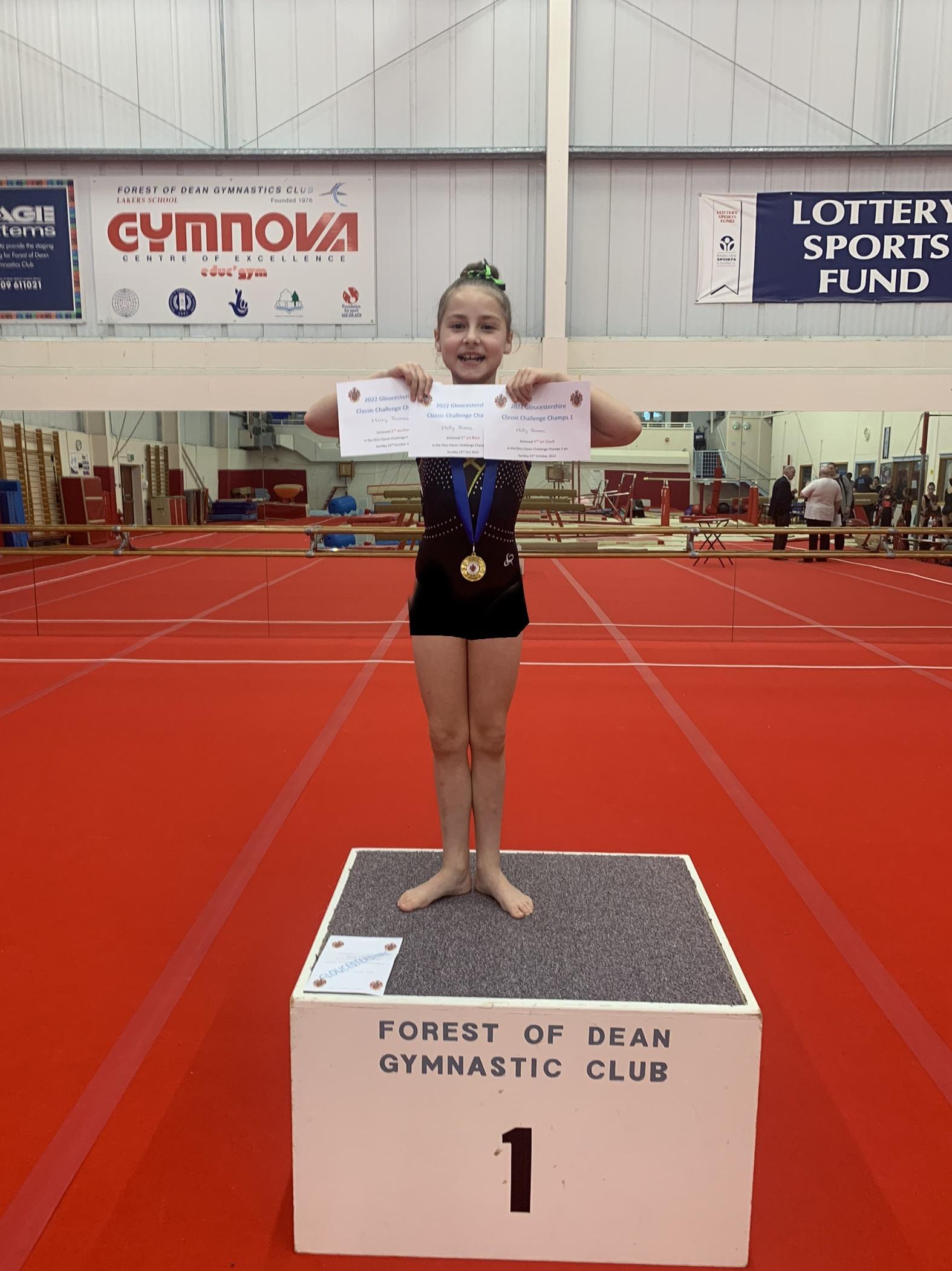 Molly entered the Gloucestershire Gymnastics Championships 2022 and won 1st place- an overall winner in her category.